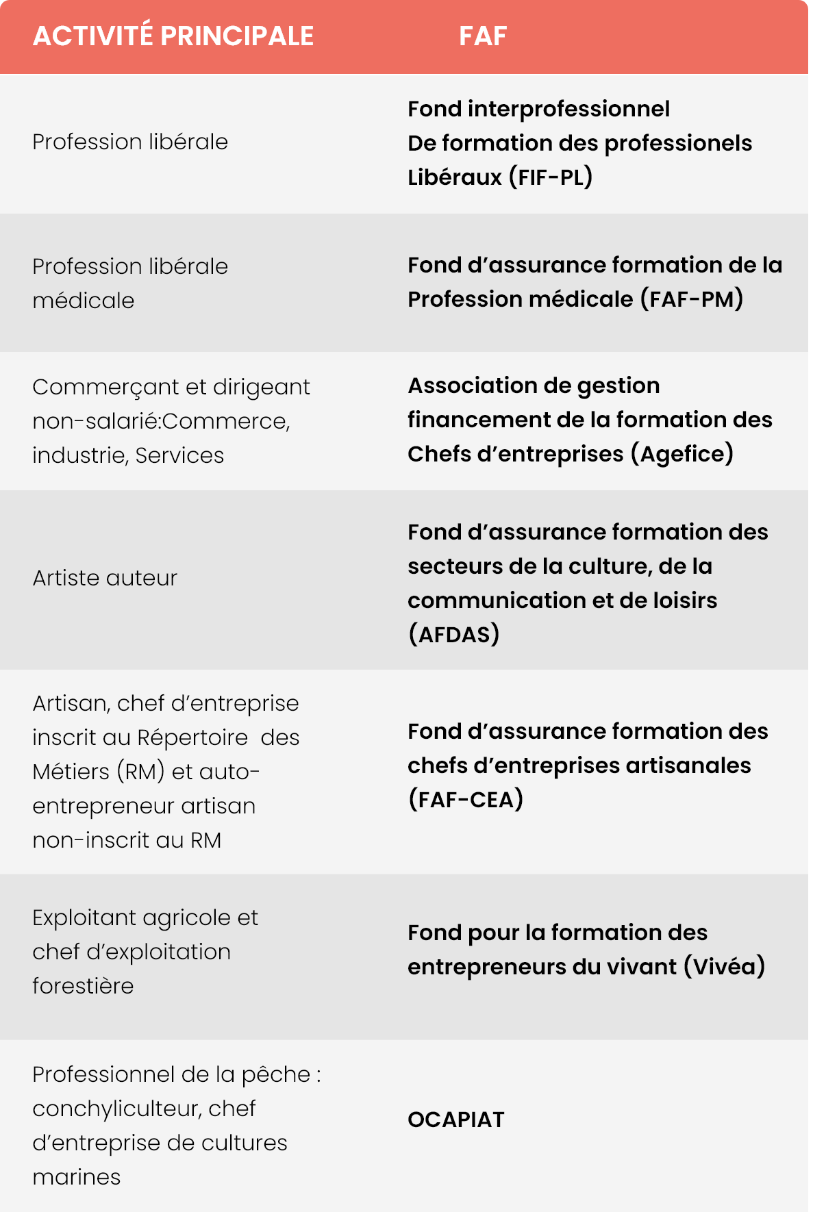Les travailleurs indépendants peuvent bénéficier d’une aide au financement de leurs formations grâce au FAF (Fond d’Assurance-Formation). Il existe 7 FAF, correspondants aux différentes activités